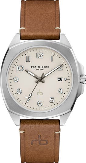 Arabic numeral markers and a handy date window emphasize the classic design of this quartz-powered timepiece fitted with a rich leather strap.