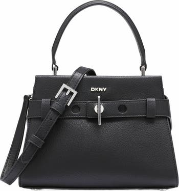 This leather satchel by DKNY is an ideal everyday bag. Crafted in a classic satchel silhouette with a bright white tone, the interior offers multiple pockets to keep you organized.