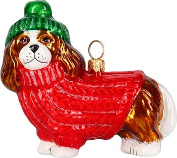 Outfitted for the season in a glitter-dusted reindeer costume, this hand-painted glass ornament is the perfect way to pupdate your holiday decor.