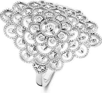 This statement ring from DPT Antwerp showcases a bold geometric pattern centered with 10 natural diamonds. Crafted in Sterling silver, it delivers confident shine and artisan detail in every glance.