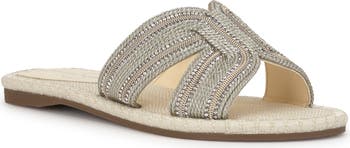 Sparkle and texture spruce up this easygoing slide sandal framed with whipstitch trim at the welt.