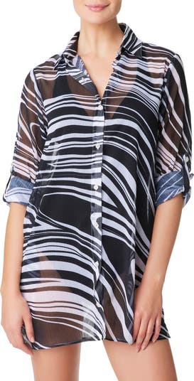 Swoopy waves give a throwback mod look to a filmy button-up tunic sure to get compliments at the tiki bar.