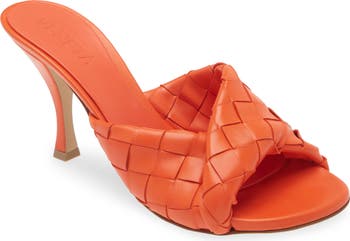 An intrecciato Mobius strip of lambskin leather comprises the upper of this slide sandal perched on a slender pedestal heel. Pebbled rubber on the sole brings excellent nonslip traction to the effortlessly chic look.