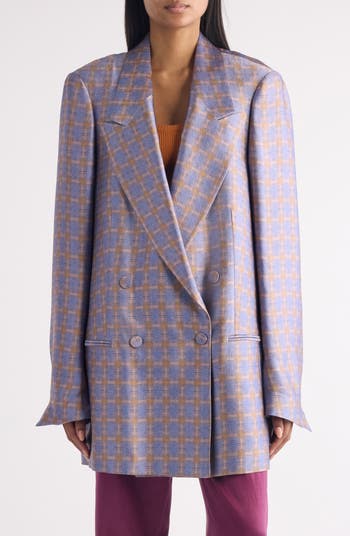 The Belgian label's blazer silhouette du moment—oversized, double-breasted, peaked lapels—is updated in lustrous silk-enriched twill with spray-painted checks.