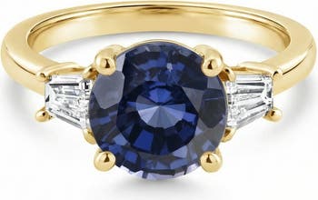 Celebrate timeless elegance with this breathtaking blue sapphire and diamond ring, designed to capture both sophistication and modern luxury. At its center sits a stunning 9mm lab-grown blue sapphire, radiating deep, velvety hues that symbolize wisdom, loyalty, and enduring love. Framing the center stone are two exquisitely tapered baguette lab-grown diamonds, adding a refined brilliance and clean, architectural balance to the design. With a total carat weight of 4 3/4 carats, this ring offers a bold yet graceful statement that transitions effortlessly from engagement to anniversary wear.