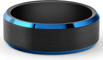 Men's Brushed Black Tungsten Ring Blue Polished Beveled Edge 8mm Wedding Band