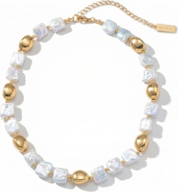 The Pina Necklace is a 16" strand of freshwater pearls and bean-shaped beads on an elegant 18k yellow gold-plated chain, with a 3" extender for adjustable length. A bold 11x11mm square pearl adds a modern touch to this timeless design.