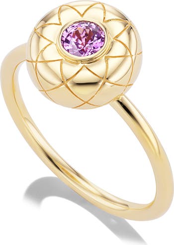 A radiant pink sapphire sparkles from the setting of this stacking ring with a geometric pattern inspired by the mandala.