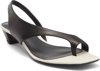 An asymmetric leather strap wraps from toe to heel shaping the curvaceous upper of this square-toe sandal boosted by a walkable block heel.