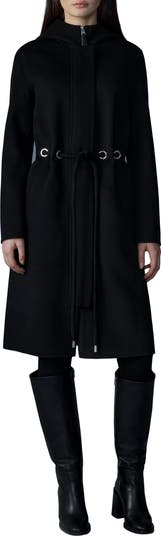 Handcrafted from warm, supple wool double face, this simply styled coat features a roomy fixed hood and a rope self-belt to thread through the gleaming grommets ringing the waist.