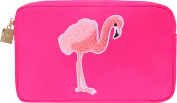 A chenille flamingo appliqué and gleaming hardware refine this nylon-canvas cosmetic bag with a trio of interior pockets to keep essentials organized.
