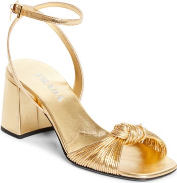 Metallic lambskin leather brings golden shimmer to this captivating ankle-strap sandal fashioned with elegantly knotted cording at the toe strap and lifted on a flared block heel.