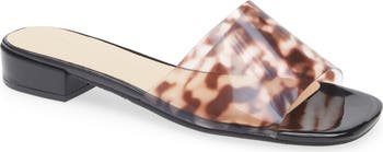 A marbled pattern on the transparent strap adds subtle sophistication to a lightly cushioned sandal set on a low block heel.
