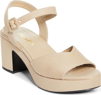 Subtle logo lettering at the vamp strap brings understated branding to an Italian-made sandal clad in cotton twill and elevated on a chunky block heel and platform.