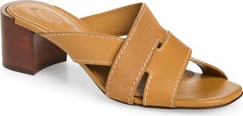 Interlocking, topstitched T-straps in calfskin leather and goatskin suede create the cutout band of this block-heel slide sandal, bringing timeless elegance to your warm-weather looks.
