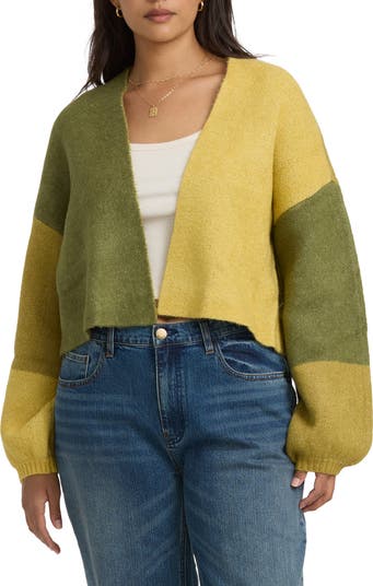 This open-front cardigan features a modern color block design that adds a pop of color to any outfit.