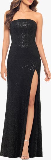 A corset-inspired bodice adds just the right amount of structure to a fitted gown that shows a daring amount of leg with a thigh-high front slit.