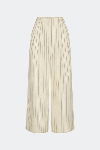 High-waisted wide-leg linen trousers in cream pinstripe, with front pleats, belt loops, side pockets and a right back pocket. Cut from a 55% linen / 45% cotton woven fabric with partial cotton lining, they finish full length for a tailored yet relaxed silhouette. Pair with the Mori Strapless Linen Top for a coordinated set. Dry clean for best results.