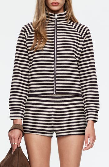 Bold stripes and a stand collar maximize the modern sophistication of this zip-front knit jacket.