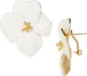 Smooth enamel enhances the sculptural look of these floral drop earrings centered by bezel-set cubic zirconia.