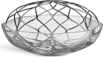 A metal cage nestles on top of sculpted mouth-blown glass to support your favorite blooms as you display them in this low vase.