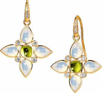 Luminous and softly expressive, these floral drop earrings capture the beauty of light in motion. Crafted in 18K yellow gold, glowing moon quartz petals surround a vibrant center gemstone, accented with delicate diamonds for subtle brilliance. The silhouette feels both sculptural and airy, offering a refined balance of color, light, and form that elevates everyday wear.