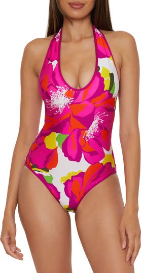 Contrast binding defines this pretty one-piece swimsuit with a reversible pattern for two looks in one.