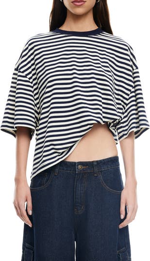 Dropped shoulders enhance the relaxed fit of this lively striped T-shirt framed by elbow-length sleeves.