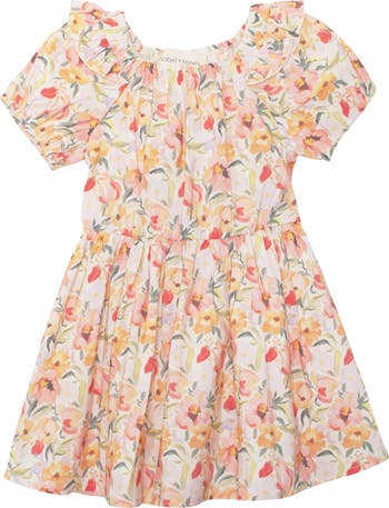 This wrinkle-free soft-hand woven dress features a vibrant floral pattern, complemented by short puffed sleeves and a square elastic neckline. Fabric Care & Content Machine Wash Cold | Line Dry | Do Not Bleach 100% Polyester