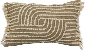 Multicolor cotton slub lumbar pillow with embroidery and fringe; Cover: 100% Cotton; Filler: 100% Conjugate Silicone; 20" L x 12" W x 1" H