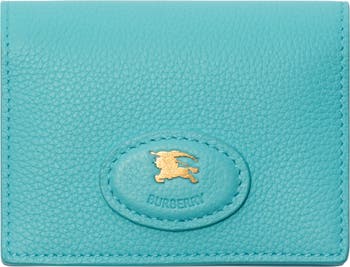 A slim folding card case made in Italy from grainy calf leather, lined with a Burberry Check cotton linen blend in a seasonal atom blue colourway. The Bloomsbury collection is finished with a leather and metal Knight stamp, an archival motif first seen on Burberry bags in the 1980s.||Four card slots|Hand-painted edges|Leather patch with Equestrian Knight Design at front|Embossed Burberry lettering at inner|Comes with a dust bag