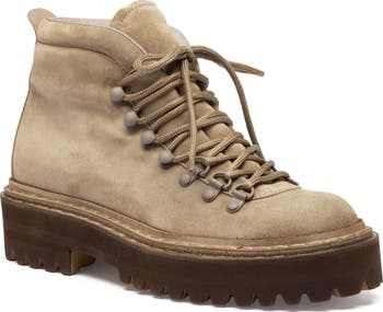 Handcrafted by Italian artisans, this beige leather bootie features a soft tonal suede finish and a sturdy 2.17" block heel that carries you effortlessly from morning to evening. A lace-up closure and round toe lend a clean, polished silhouette, while leather lining and a rubber sole ensure lasting comfort underfoot.
