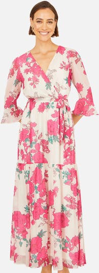 This dress features a vibrant and romantic floral print in bold tones, creating a standout look perfect for warm-weather occasions. Its wrap-style bodice gently defines the waist, while the flowing, tiered skirt offers effortless movement and elegance. Finished with soft, fluted sleeves and a lightweight drape, it brings together comfort and femininity in a beautifully flattering silhouette.
