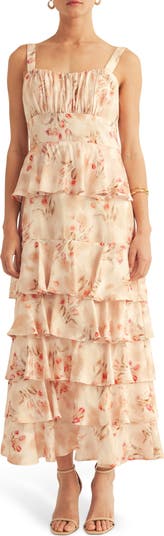 Flouncy tiered ruffles add volume and fluttering movement to this sleeveless gown covered in enchanting blooms.