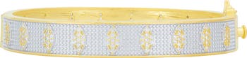 Handset cubic zirconia accent the geometric settings stationed on this sterling silver hinge bracelet plated in radiant 14-karat gold and rhodium.