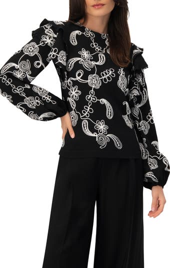 white embroidery over a black backdrop, accented with delicate shoulder ruffles. The blouson sleeves add volume to the straight cut
