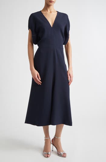 A signature silhouette from the British designer, this retro-modern midi cut from smooth stretch crepe celebrates your shape with a softly sculpted bodice that gives way to a fluid skirt. Contrast pickstitching highlights the seams down each side.