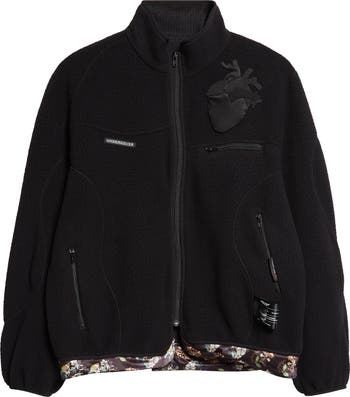 Lustrous floral silk lining peeks out below the hemline of this deconstructed fleece zip jacket sewn with an exposed label at the side seam for an inside-out effect. Wavy seams and irregular zip pockets accentuate the undone effect, while an anatomical heart appliqué embellishes the chest.