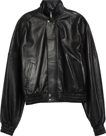 This relaxed raglan-sleeve jacket crafted from supple lambskin leather is cinched with elastic at the cuffs and hem and reflects the Vietnamese designer's aesthetic with a sleek yet tough look.