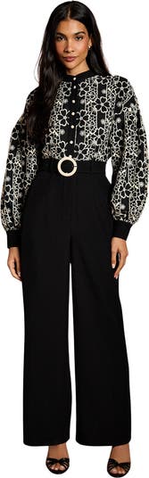Step into elegance with our sleek belted wide leg jumpsuit, featuring chic blouson sleeves. Perfect for any occasion.