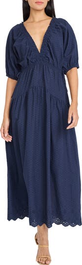 Soft shirring shapes the silhouette of this maxi dress made from soft cotton in a textured pattern and framed by billowy blouson sleeves.