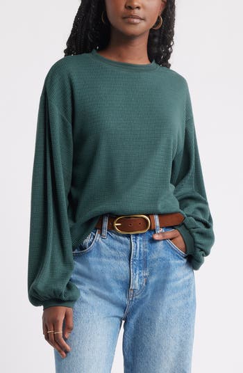 The classically cozy waffle-knit top gets a romantic refresh with long, flowy blouson sleeves that give it an elevated look.