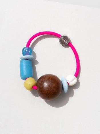 Quirky, bold, and full of personality—the BLOWFISH bracelet hair tie is a playful nod to undersea wonders and eclectic treasures. Featuring an artful arrangement of beads in unexpected shapes and colors, including a polished deep brown sphere, oceanic blue glass, earthy green cylinder, and petite accent beads, all strung on a vibrant fuchsia elastic band. Finished with the By Lilla signature metallic clasp, this piece is as fun in your hair as it is on your wrist.