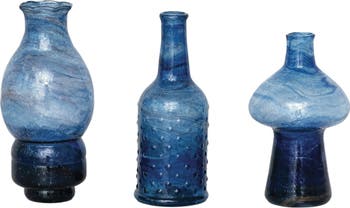 - A set of 3 blown glass vases, each featuring a unique design in a soothing blue hue that captures the essence of the ocean