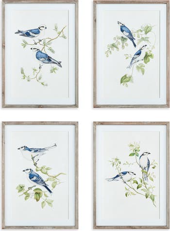 - In a soothing blue and green palette, this bird study set of four prints adds a touch of nature or the bird lover in all of us. With a crisp white mat and gray washed wood frame, a lovely set for home office, kitchen or powder room.