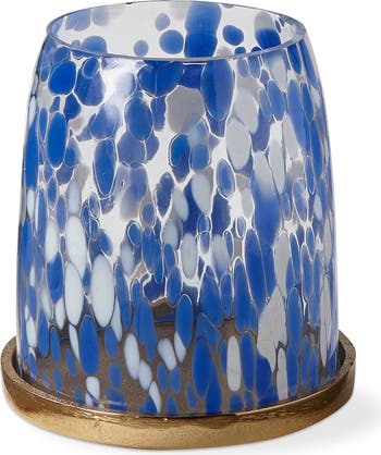 - Confetti Hurricane Small Blue Multi Glass Candle Holder is 5.5 inches high and 5 inches in diameter made of artisan blown glass with a cast aluminum base featuring a gold finish.