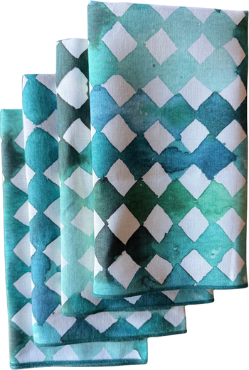The Blue Diamond Napkin is new for Spring. Painted with watercolors in a myriad of turquoise and green and lots of tonal variations in between. The painterly brushstroke is organic and the shapes are geometric creating a a beautiful pattern of mini diamonds. 18x18 inches; set of 4 100% European linen Designed in NYC, Made in Portugal Machine wash cold, lay flat to dry. Iron or dry clean optional.