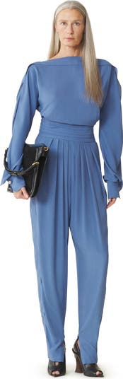 These pants are designed in a sophisticated crepe de Chine, developed in Italy, which uses viscose to achieve a lighter fabric. It pays homage to the elegant drapes designed by Jeanne Lanvin for her Haute Couture creations, with sophisticated pleats that structure and elongate the silhouette. Paired with the matching top, it maintains a polished look thanks to the crease-resistant fabric.