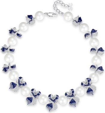 High quality royal blue enamel, sparkling cubic zirconia and luminous shell pearls transform this polished rhodium plated necklace into a true work of art. This necklace is suitable for different occasions and perfectly Match with any outfits.