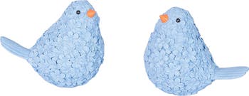 - This assortment includes 2 poly resin and calcium carbonate bird figurines, each finished in soft periwinkle blue with an all-over raised floral relief texture, an orange beak, and black eyes, facing opposite directions for a paired display.